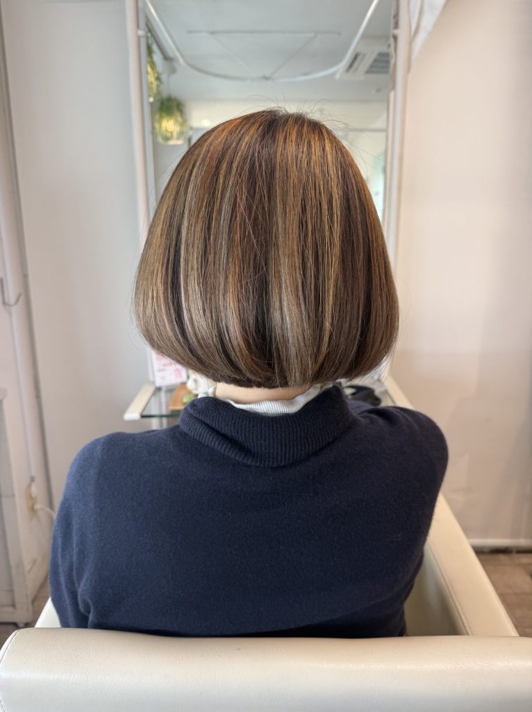 ダメージレスカラーと白髪ぼかしを組み合わせることで、髪へのダメージを最小限に抑えながら、白髪を自然にカバーする美しい仕上がりを実現できます。