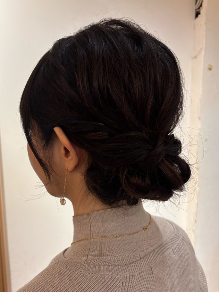 崩れにくさと華やかさを両立したヘアセット。顔周りの柔らかな雰囲気から、後ろ姿の美しいシルエットまで、360°どこから見ても素敵に仕上がります。