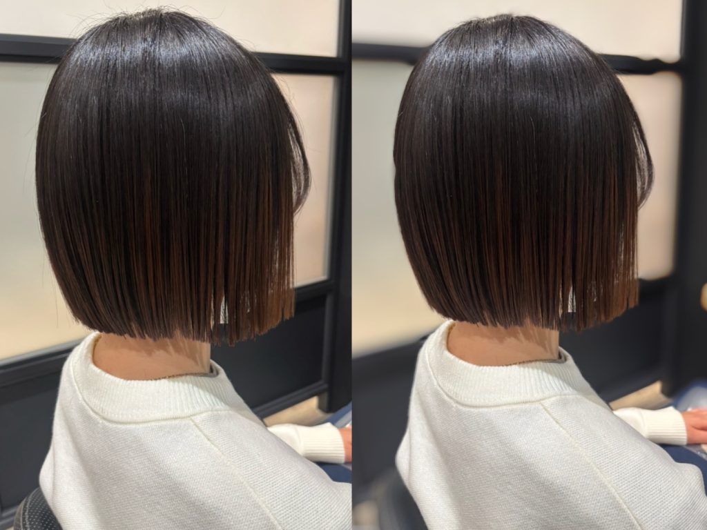 切りっぱなしボブやぱっつんボブと組み合わせることで、毛先のラインがよりくっきりと際立ち、シンプルながらも洗練された印象に仕上がります。