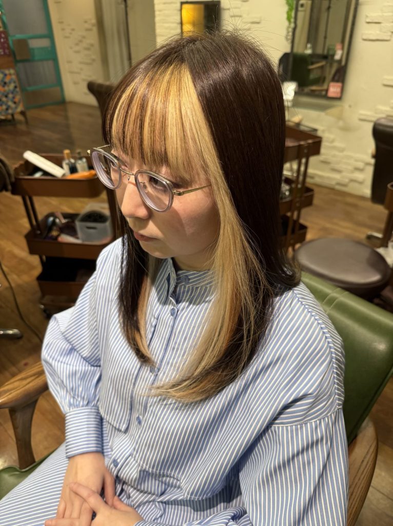 外から見ると自然なのに、髪をかき上げたり動いたりしたときにチラッと色が見えるのがポイント。大人の女性にも取り入れやすく、さりげないオシャレが楽しめます。